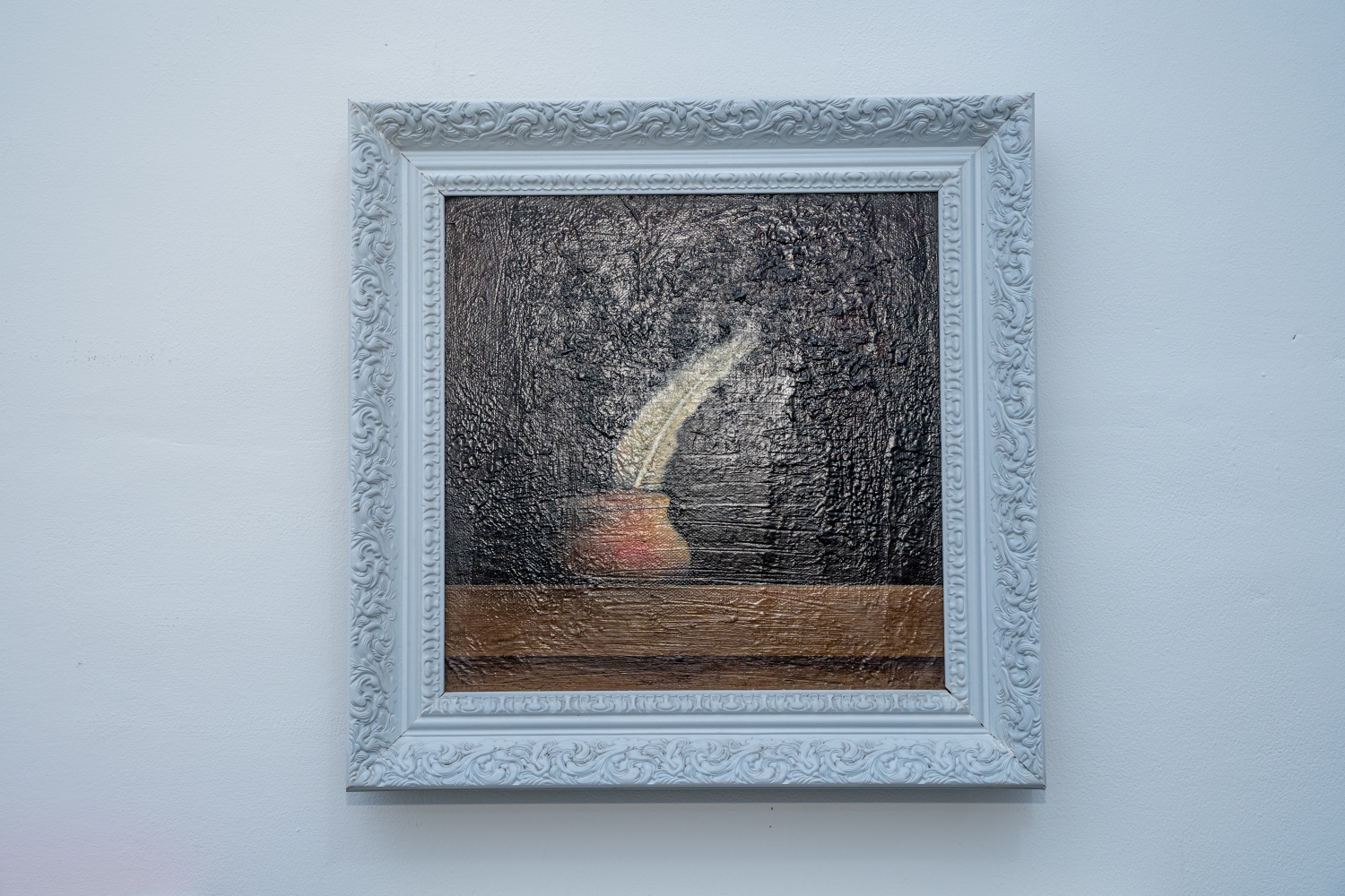 Kary ini merupakan buah representasi dari hal tersebut, objek yang diwujudkan dalam karya ini menjadi simbol yang menjadi tanda benda. Benda atau objek dalam karya ini diwujudkan dalam bentuk wadah tinta dan bulu, yang secara kesatuan menjadi alat untuk menulis. Keberadaan alat untuk menulis membantu untuk mengisi tiap-tiap bagian dari buku catatan. Buku catatan yang nantinya membantu membuka pikiran, kesadaran, pengalaman, emosi, juga sebagai kekuatan. Oleh karena itu perwakilan alat untuk menulis adalah azimat, dan buku catatan adalah bagian tubuh yang diperluas. Kedua hal ini bagi saya sebagai perupa menjadi sebuah pegangan yang menyimpan kekuatan.