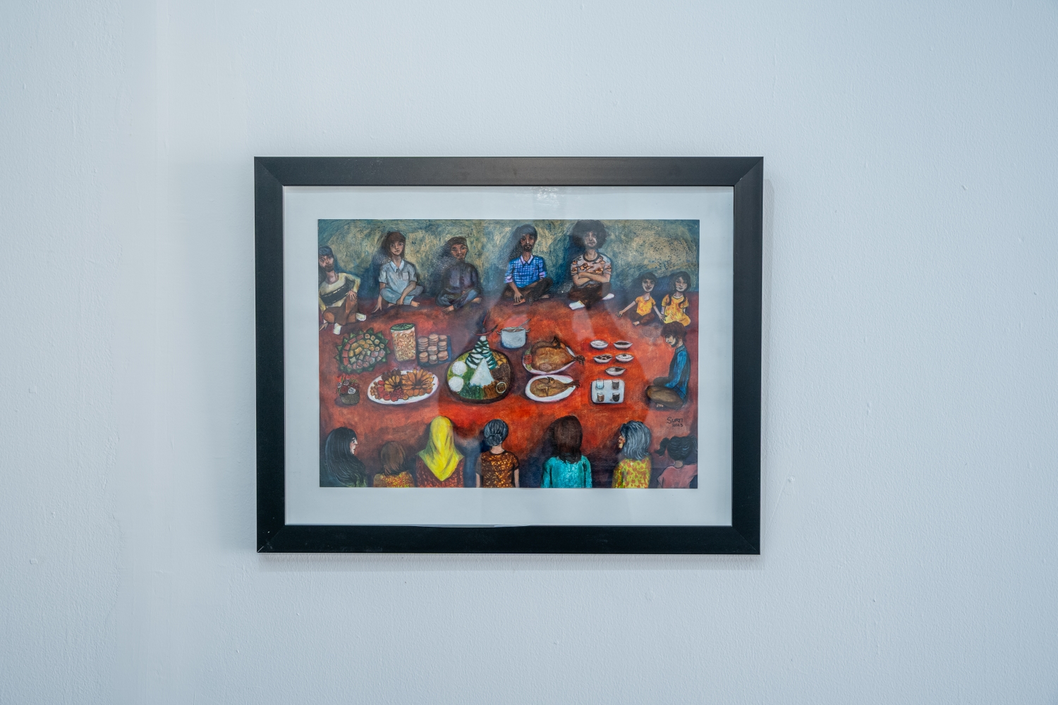 Karya ini berbahan kertas dengan menggunakan berbagai media, yaitu cat air, cat akrilik, crayon, pensil warna dan water-based marker. Lukisan ini banyak menggunakan tone warna biru digunakan untuk memberi kesan yang tenang dan damai. Penggunaan aksen warna keemasan digunakan untuk menggambarkan kemakmuran. Warna merah digunakan untuk mewakili makna kegembiraan.