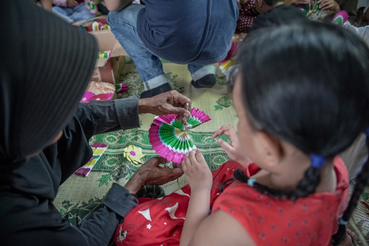 Proses pembuatan kipas lipat dari limbah kertas yang dilakukan oleh anak-anak.