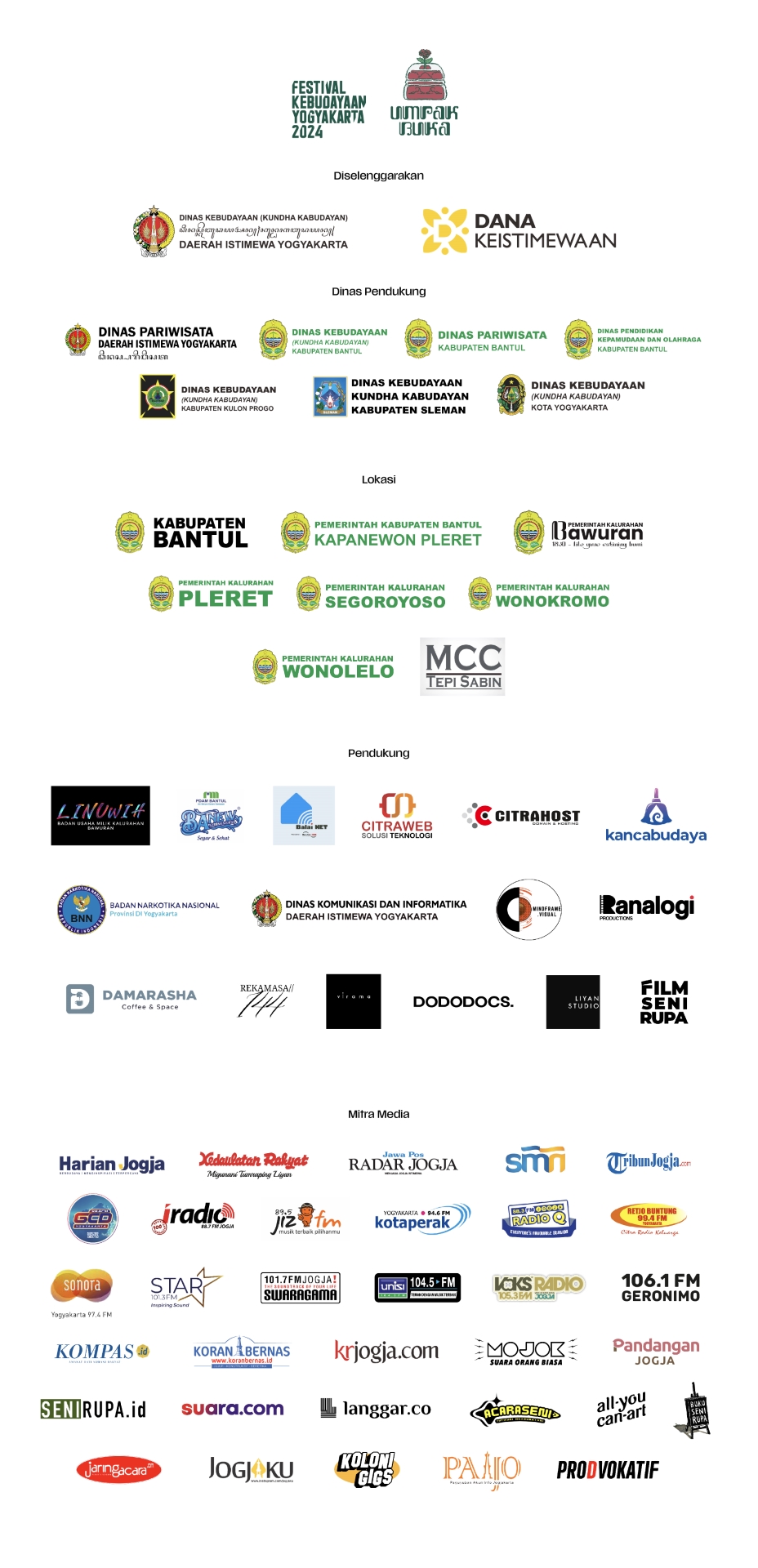 Empat kabupaten (Kulon Progo, Gunung Kidul, Bantul, Sleman) dan satu kota (Yogyakarta) akan bergiliran sebagai pusat lokasi festival setiap tahunnya. Tahun ini FKY 2024 digelar di Bantul sebagai rangkaian kedua setelah kulon progo. Melalui skema ini, FKY berupaya menyingkap dinamika kebudayaan Yogyakarta yang lebih berwarna dan berdaya.